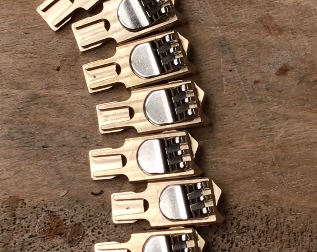 At the top and bottom of the arms, you’ll notice brass teeth — larger ones near the hinge and smaller ones at the end of the arms. The purpose is simple yet effective: they grip the denim to the brass, ensuring a secure, lasting connection. While other brands may hide such functional details, we embrace them for their beauty and purpose. And, of course, Jack spent countless hours perfecting these joints, obsessed with every detail to ensure they were as visually striking as they were functional.